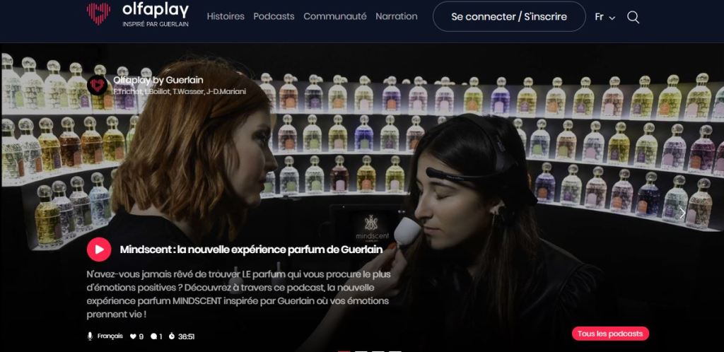 L’audio a ses règles spécifiques de contenu. Il nécessite une incarnation forte pour porter vos sujets, une histoire qui puisse captiver l’auditoire, la création d’une intimité avec l’auditeur, une production de qualité pour un confort d’écoute maximale, un séquençage. C’est un support souple et intéressant pour diffuser le storytelling d’une marque. Le luxe, la banque, l’assurance et aussi l’industrie pharmaceutique s’en sont emparés. Exemple avec la plateforme Olfaplay de Guerlain qui propose de nombreux contenus : histoires, témoignages en 6 langues et a créé sa propre communauté fermée.